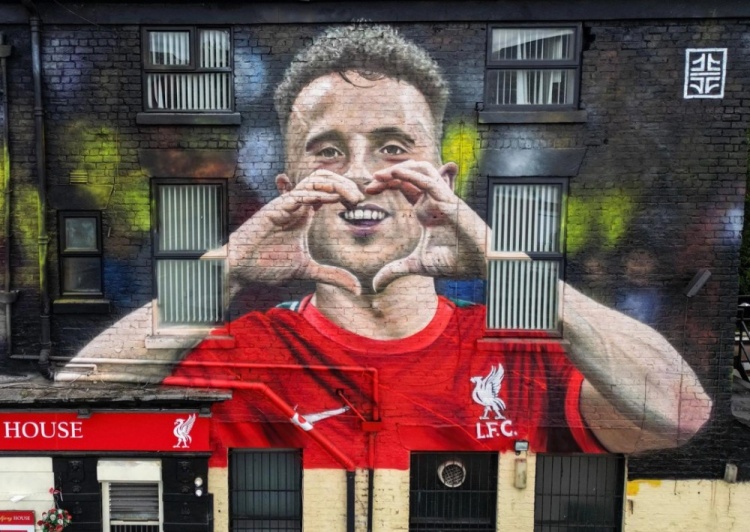 这幅画描绘了若塔庆祝进球的瞬间。壁画位于距离红军主场不远处的半路屋酒吧外墙上,这里离若塔自2020年9月从狼队加盟后享受过无数欢乐时光的地方仅几步之遥。